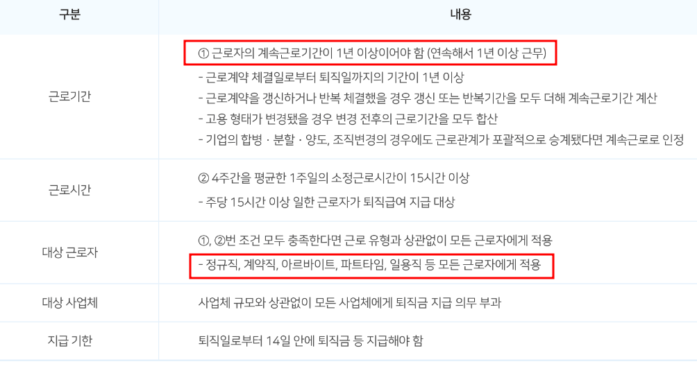 알바생들의 퇴직금 지급조건에서 가장 중요한 것은 "계속근로기간 1년 이상", "1주일 소정근로시간 15시간 이상" 이 2가지 내용이 가장 중요합니다.